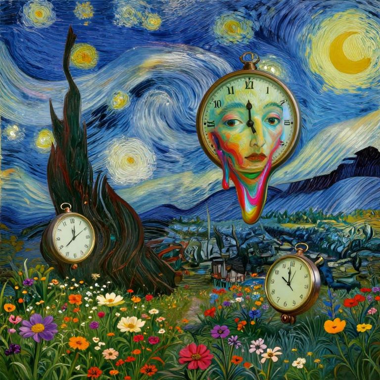 A surreal dreamscape unfolds in this unique fusion of two iconic styles, featuring a whimsical scene where floating timepieces and swirling galaxies dance amidst fields of vibrant flowers. The dreamlike atmosphere is revealed from an aerial perspective above a sprawling landscape, with the melting faces of these timepieces reflecting vivid hues against a backdrop of shimmering stars and nebulae. This captivating image evokes both enchantment and introspection as it challenges our perception of time and reality, capturing the essence of Dali-esque imagery while infused with the emotional depth and rich color palette characteristic of Van Gogh's work.