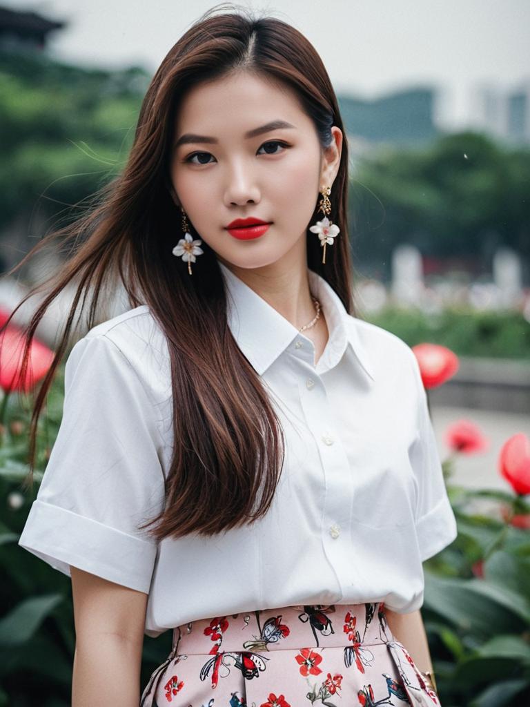 Chinese luxury fashion, 1girl, solo, long hair, brown hair, looking at viewer, jewelry, earrings, flower, shirt, blurry, blurry background, white shirt, outdoors, day, red lips, k-pop, skirt, bug, pink flower