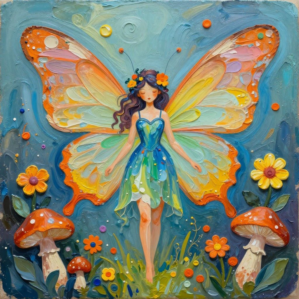 A whimsical acrylic painting of a playful sprite with bright orange hair, surrounded by swirling colorful leaves, vibrant flowers, and sparkling dew in a lively autumn forest. The artwork features bold outlines and a vibrant, magical ambiance, highlighting the energy and enchantment of the sprite dancing along a blue winding path through the forest.