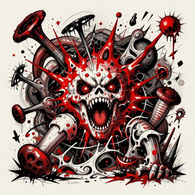 Grindcore art portraying a visceral explosion of abstract forms and chaotic compositions, filled with jagged edges, blood-red highlights, and distorted anatomical features, conveying a sense of anarchic noise and aggression.