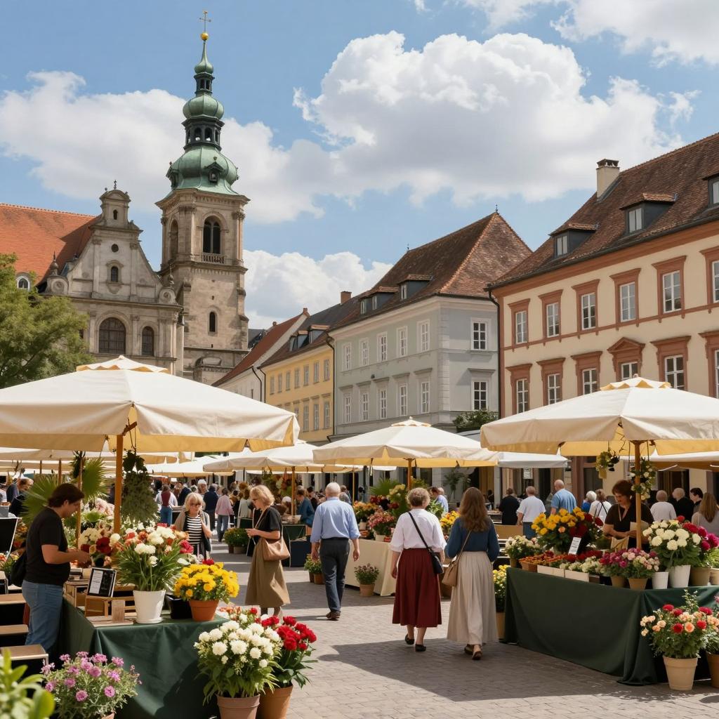 A vibrant outdoor flower market set in a historic European town square. The market features numerous stalls with colorful flowers under cream and yellow awnings. People dressed in traditional garments wander between the stalls. Classic European architecture with tall buildings and steep roofs surrounds the square beneath a blue sky with scattered clouds.