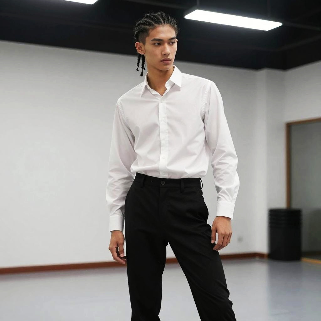 Pompadour Fade hairstyle on man, wearing tailored suit, in runway, captured in fashion editorial style with harsh midday sunlight.
