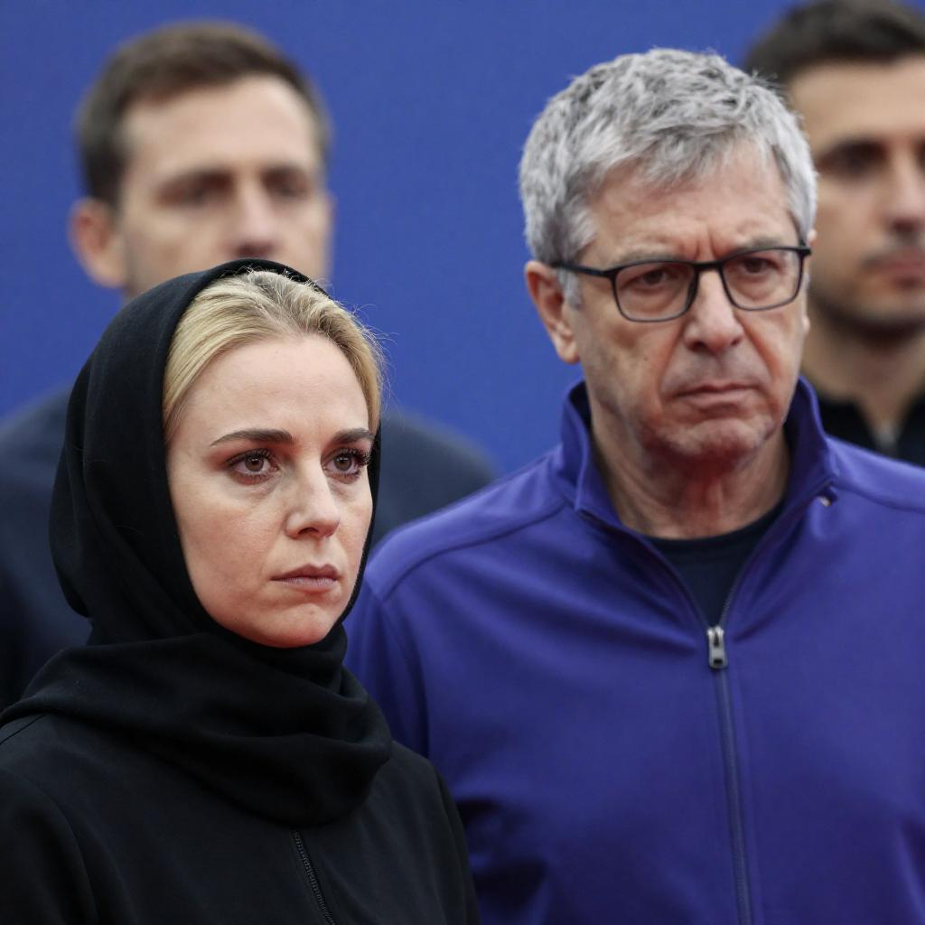 Close-up photograph of a serious blonde woman wearing a black headscarf and a concerned older man with grey hair, glasses, and a purple zip-up jacket. Two blurred men are visible in the blue background behind them. The image captures a solemn or contemplative mood.
