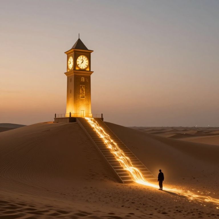 Clocktower stands sentinel atop a sandy mound in a vast desert, its golden clocks casting radiant light as time seems to flow down its steps in shimmering streams, while a lone figure below collects the luminous essence in a glowing trail that stretches toward the horizon.