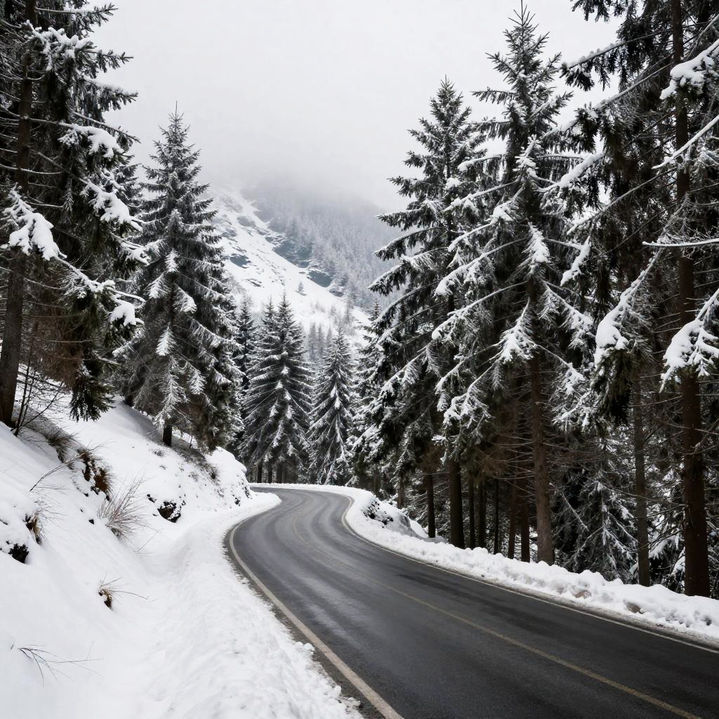 Misty Snowy Mountain Forest Road
