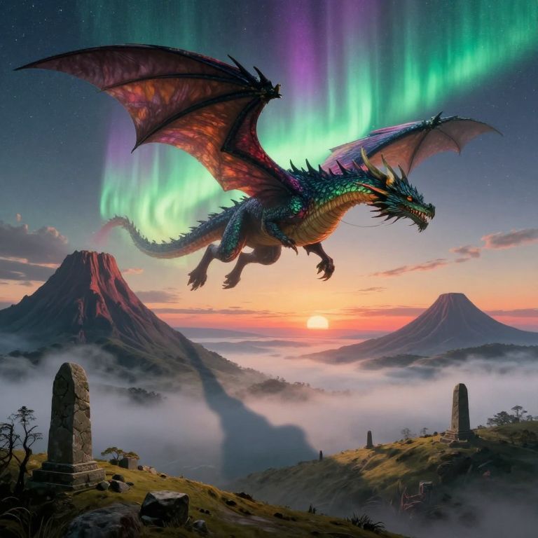 Craft an image in the enchanting style reminiscent of Gustave Doré's engravings, portraying a colossal mythical beast soaring through an ethereal misty landscape at sunset. The awe-inspiring creature casts an elongated shadow across rolling hills adorned with ancient stone monuments as it gracefully navigates between towering volcanic peaks. The scene is illuminated by a vibrant aurora borealis casting its otherworldly hues onto the dragon's iridescent scales and the surrounding environment, evoking a sense of awe and wonder that transcends time and space.