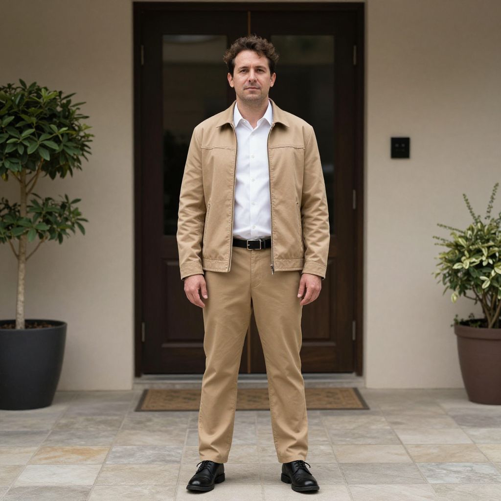 Photograph of a middle-aged man with short dark hair, wearing a beige jacket, white shirt, tan pants, black belt, and black shoes,