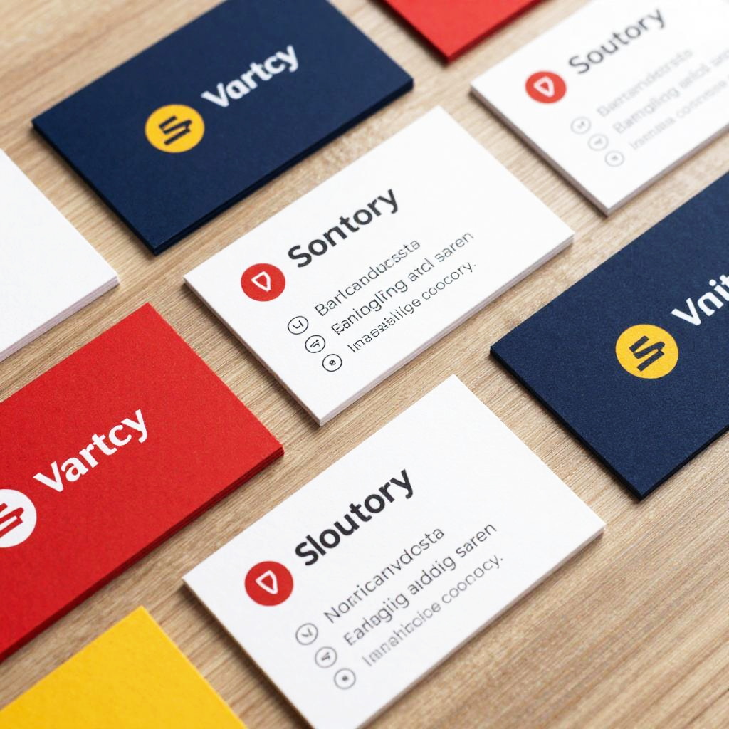 Visitenkarten creative layout showcasing unique fonts and vibrant colors, flat lay of various business cards on a wooden desk, artistic and eye-catching, with modern graphic elements, 4k detail, professional and stylish presentation