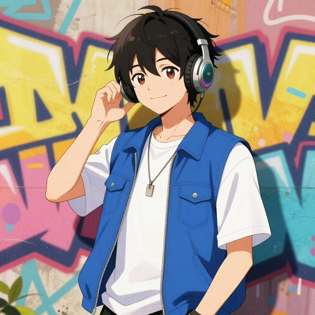 Nerdy anime guy dressed in school uniform with a backpack full of gadgets, shy smile, leaning against a wall covered in anime graffiti art, vibrant color palette