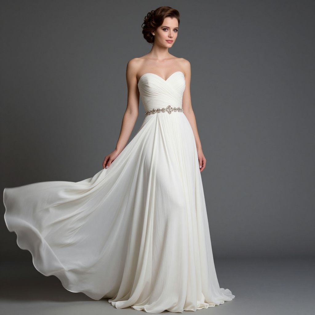 Elegant woman showcasing a strapless ivory white gown with a flowing skirt and embellished waistband, exuding Hollywood glamour and romantic sophistication.