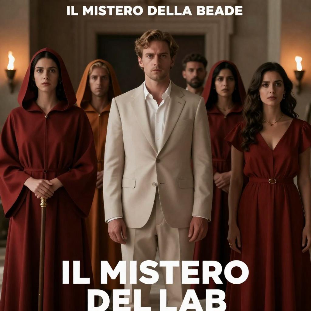 Movie poster of "Il Mistero della Piramide" featuring a group of people in a dimly lit room. Centered man in light-colored suit, others in red and orange robes with hoods. Man on left holding staff, woman on right in red dress. Facial expressions range from serious to concerned. Torches in background.