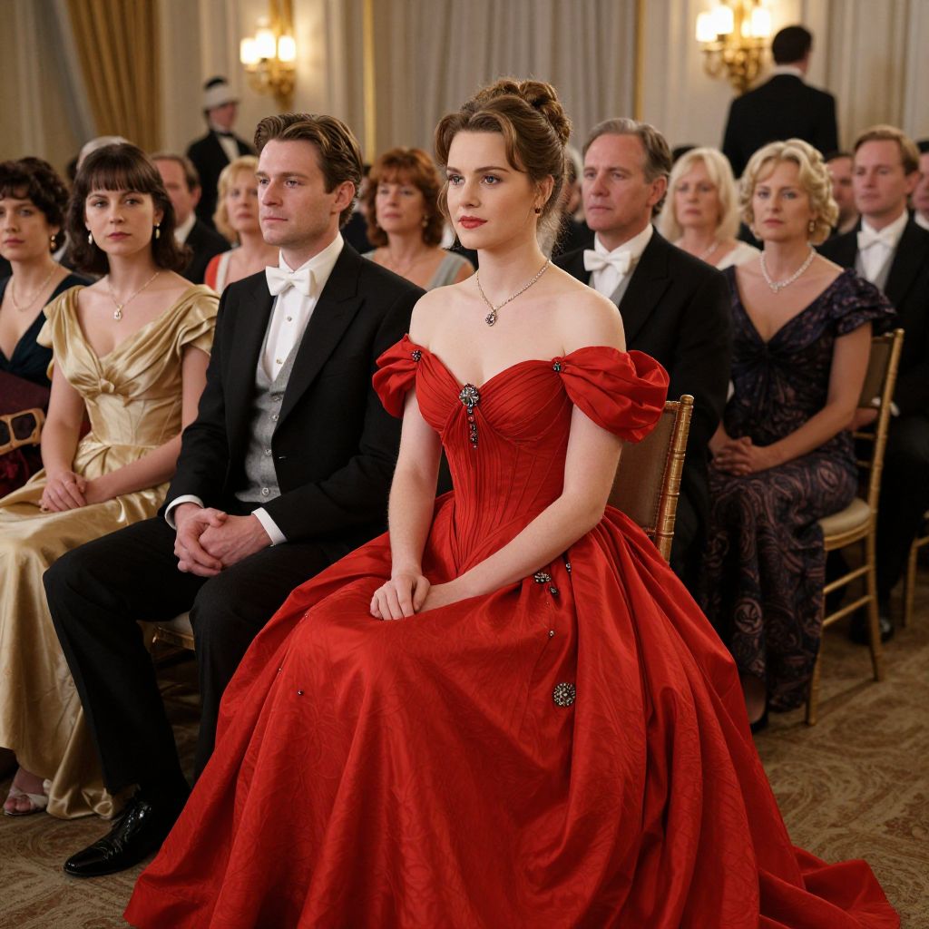 Photograph of an elegant fashion show audience. Front and center is a fair-skinned woman with brown hair in an updo, wearing a vibrant red, off-the-shoulder, ball gown with puffed sleeves and intricate silver embellishments. She sits with hands on her lap, exuding grace. To her right is a fair-skinned man in a black tuxedo with a white shirt and black bow tie. Surrounding them are diverse attendees, including a woman in a gold satin dress and a blonde woman in a black patterned dress. The background features a luxurious, gold-draped room with warm, soft lighting and ornate wall sconces.