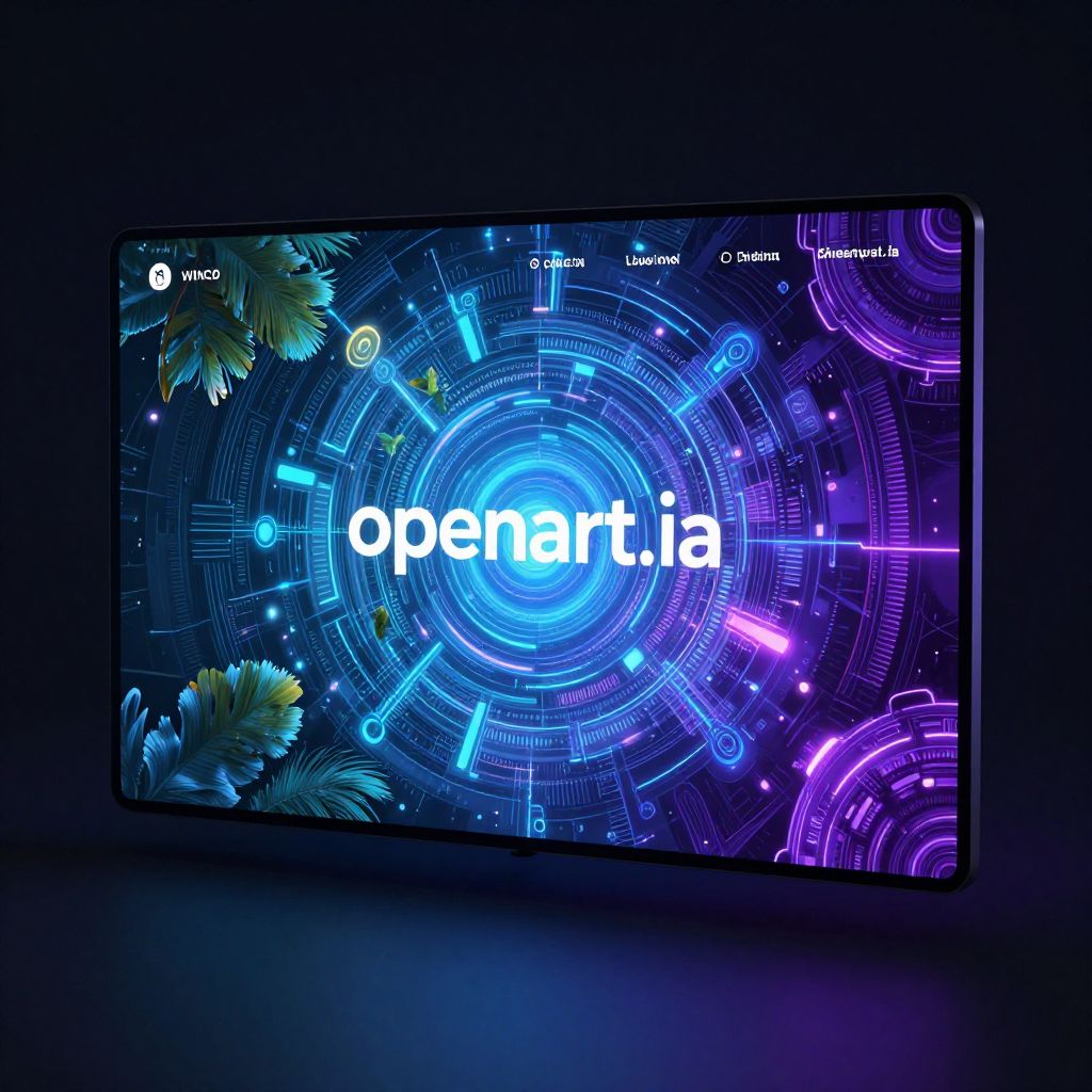 Openart.ia futuristic digital art platform interface, neon glowing holographic elements, intricate patterns blending nature and technology, sleek user interface design, vibrant color palette with blues and purples, high detail and cinematic lighting