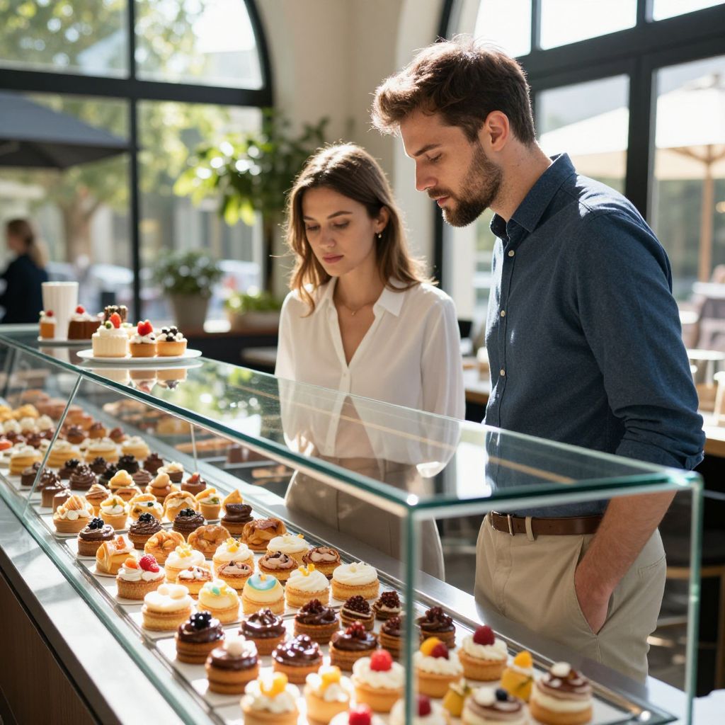 Photograph of a young woman with shoulder-length brown hair, wearing a black T-shirt, standing behind a white countertop in a bright, modern store. She faces another woman with similar hair and attire, also in a black T-shirt. The counter displays an array of colorful mason jars filled with various fruits, including oranges, grapes, and green grapes. Two potted plants are positioned between the jars. Large windows in the background reveal a bustling street scene with blurred pedestrians. The overall ambiance is casual and contemporary, with natural light illuminating the space.