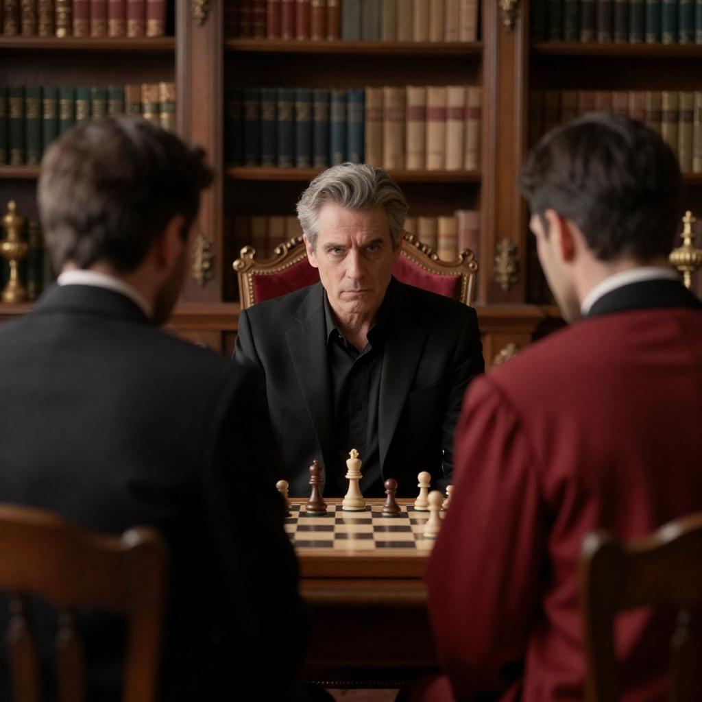 Middle-aged man with gray hair, intense gaze, wearing dark jacket and gray shirt, stands front and center. Large, menacing bird with outstretched wings hovers behind him. Dark, stormy sky with castle and flying creatures in background.