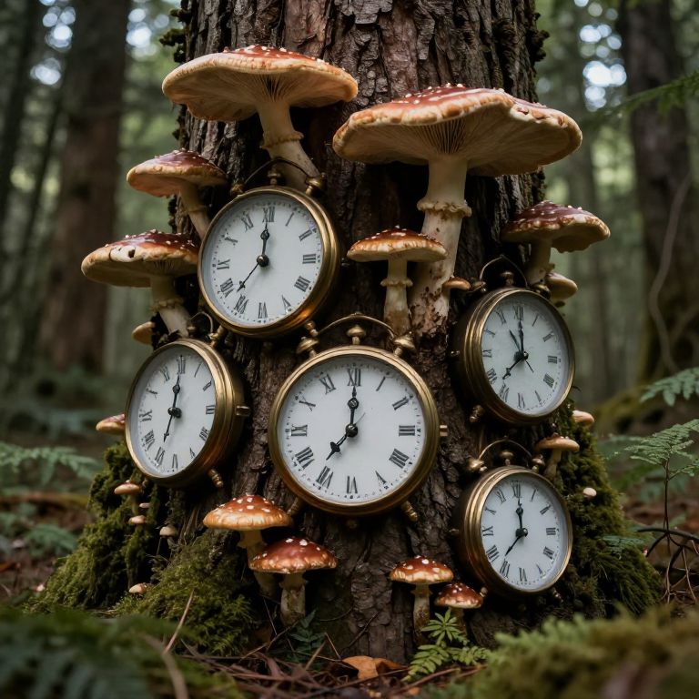 Clocks grow in a forest like fungi, their ticking symbiotic with the breath of sleeping giants who dream in slow motion.