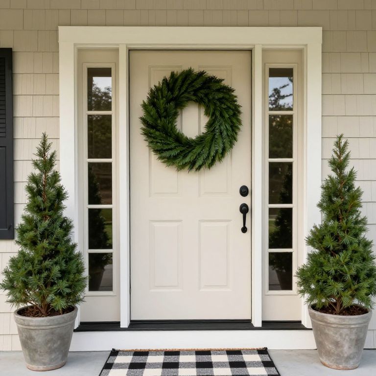 Natural green wreath adorns a classic cream-colored front door flanked by two glass-paneled sidelights, complemented by black hardware and framed by potted evergreens on either side, set against a light beige shiplap exterior wall and accented by a checkered black-and-white rug on the gray concrete porch.