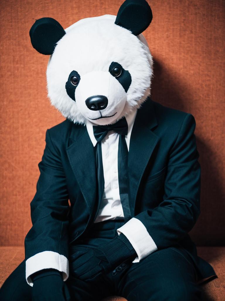 Man cosplay. Wearing Monokuma costume. Realistic photo. Dressed as Monokuma --sref 1392