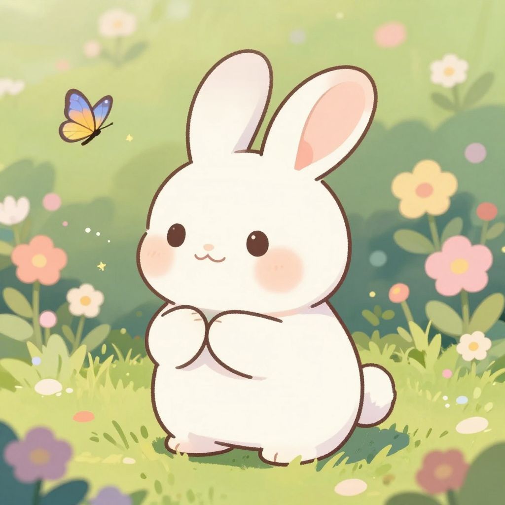A cute, digital anime-style drawing of a white, chubby bunny with large pink ears, black round eyes, and a small pink blush on its cheeks. The bunny stands on green grass, with its paws held close to its chest. A yellow and blue butterfly hovers nearby. The background features a soft, blurred garden with colorful flowers in pink, yellow, and purple, and a green, sunlit gradient. The bunny's expression is innocent and adorable. The overall style is kawaii, with a pastel color palette and gentle, warm lighting.