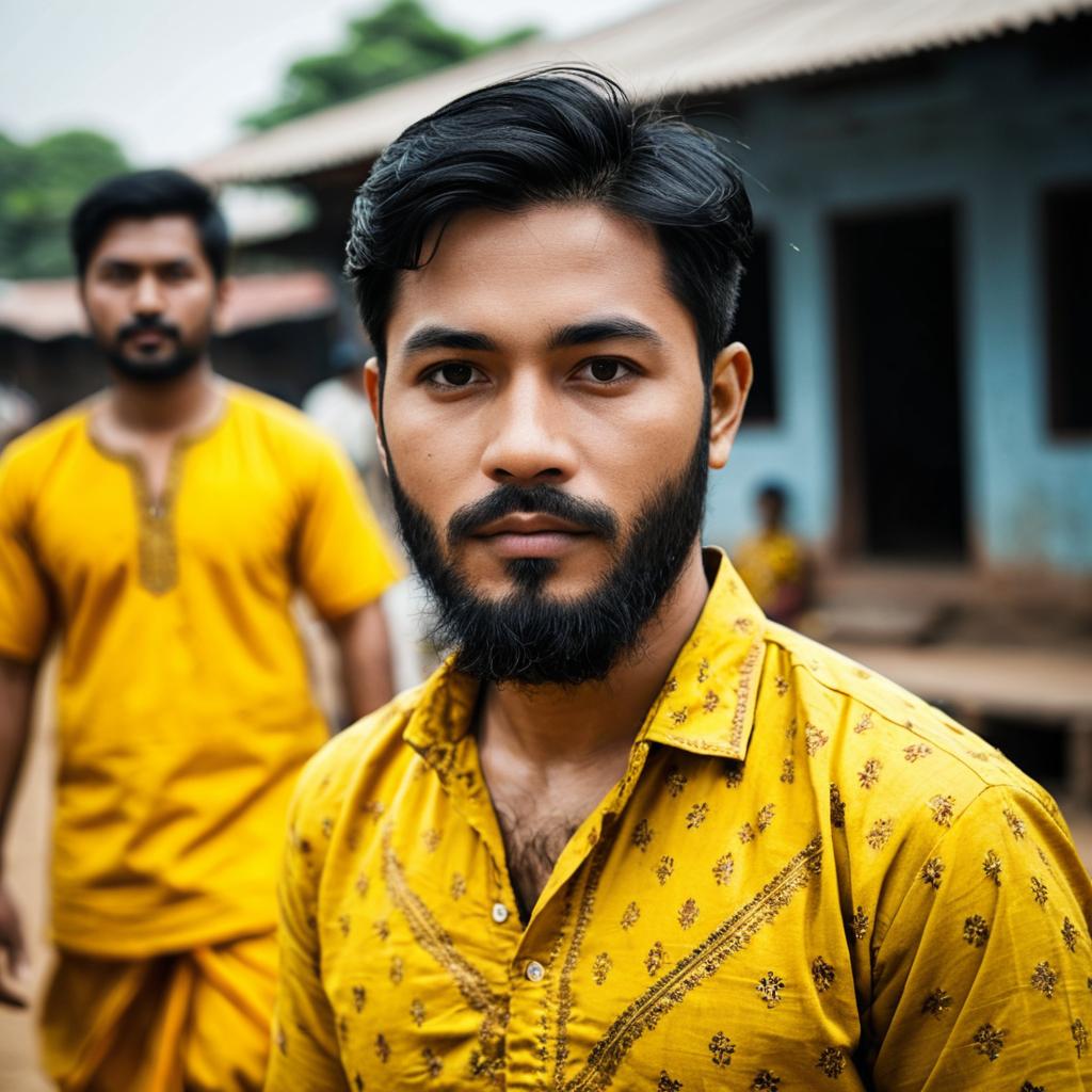 Portrait of a young Asian man with black hair and a beard wearing a traditional yellow haldi dress. He is looking directly at the camera with a calm expression. The background shows a second man dressed similarly, blurred out to emphasize the main subject. The setting appears to be an outdoor rural or village area.
