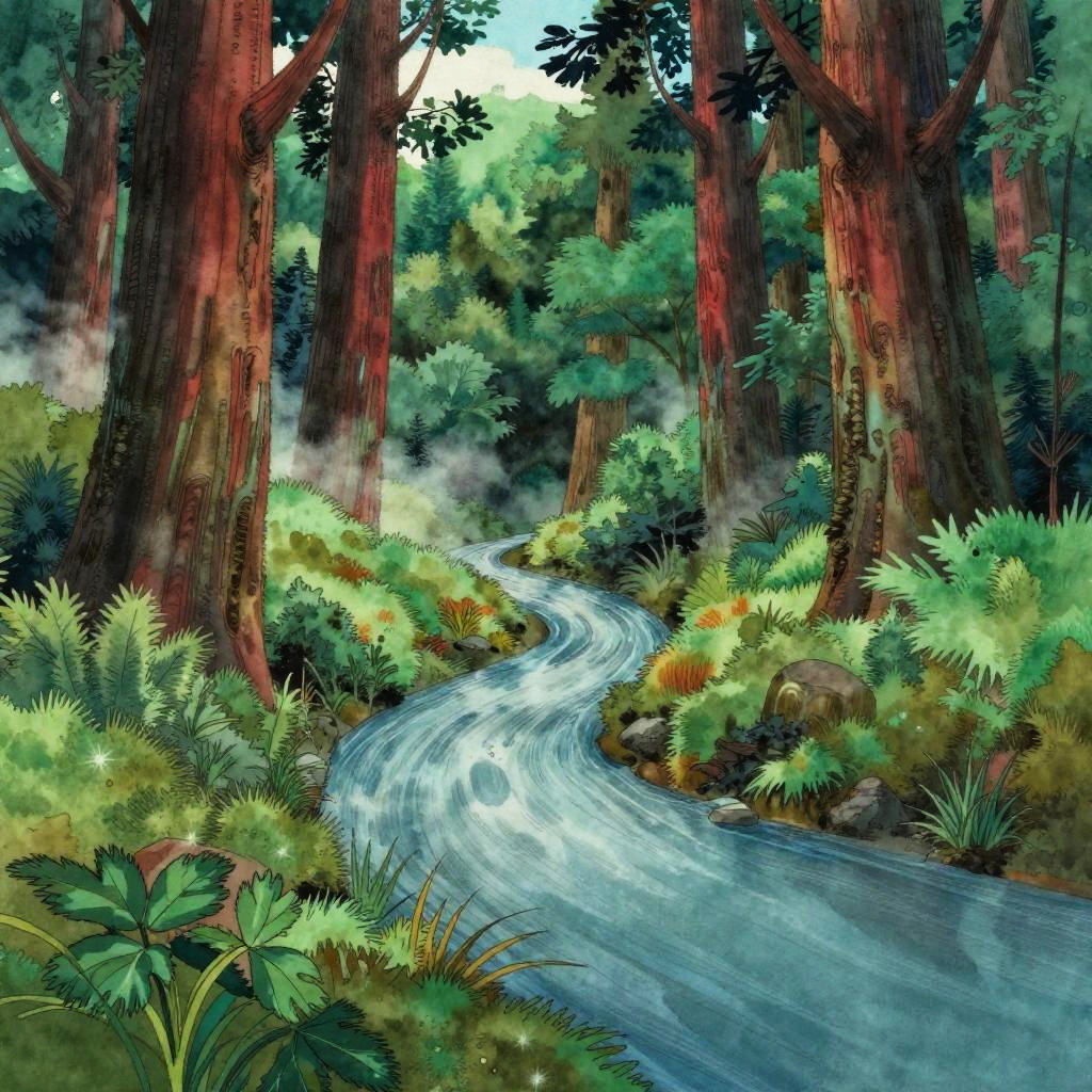 Tattoo art landscape, a winding river surrounded by dense fog and towering redwoods, surreal, vibrant, hand-drawn, watercolors, style of Hayao Miyazaki