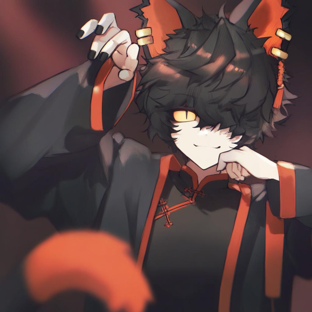 Aak (arknights), arknights, 1boy, furry male, cat boy, cat ears, ear piercing, tail, animal ears, yellow eyes, slit pupils, hair over one eye, black hair, short hair, chinese clothes, black nails, yellow sclera, by artist wata (attaka towel), leet