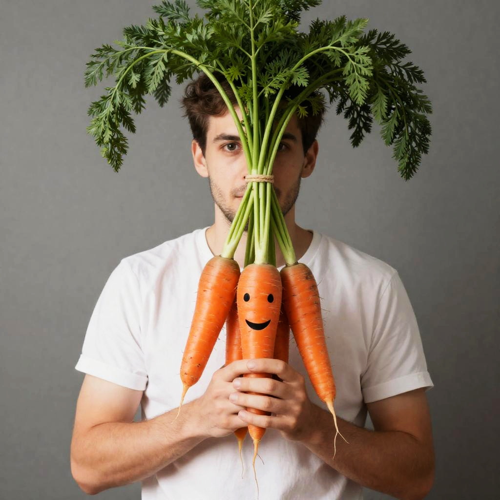 Funny Vegetable, man holding a bunch of carrots with a face on it