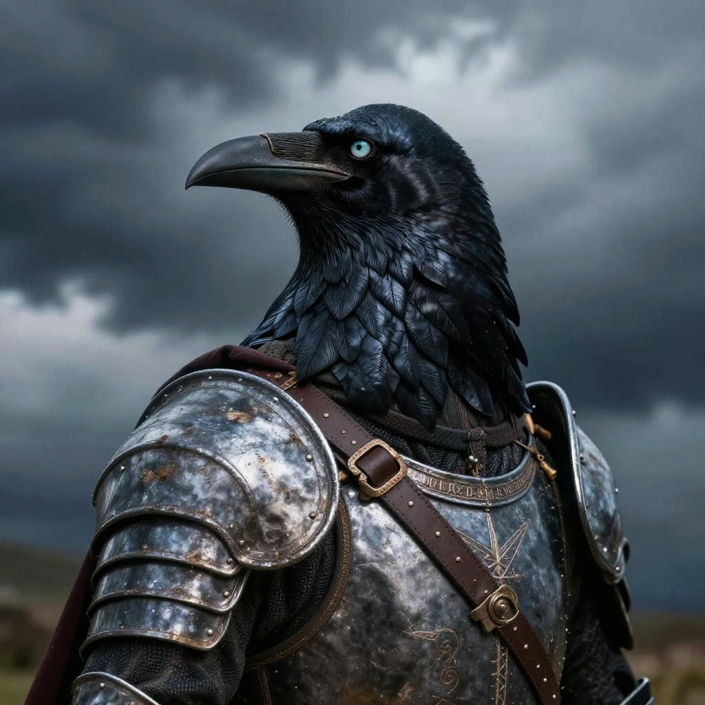 Raven on shoulder of a medieval warrior clad in armor, stormy sky backdrop, fierce eyes, dramatic lighting, hyperrealistic texture, fantasy epic scene