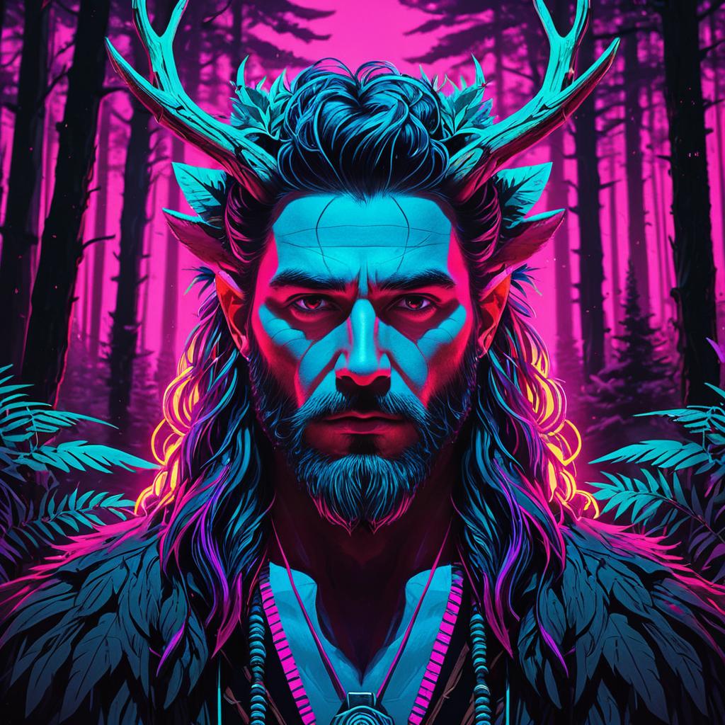 Cel-shaded portrait of mystical forest druid in vibrant neon synthwave, concept art by Josan Gonzalez and Wlop, highly detailed, sharp focus, trending on ArtStation, HQ