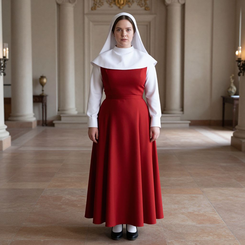 Handmaids Tale Costume Plus Size, nun in a red and white dress standing in a large room