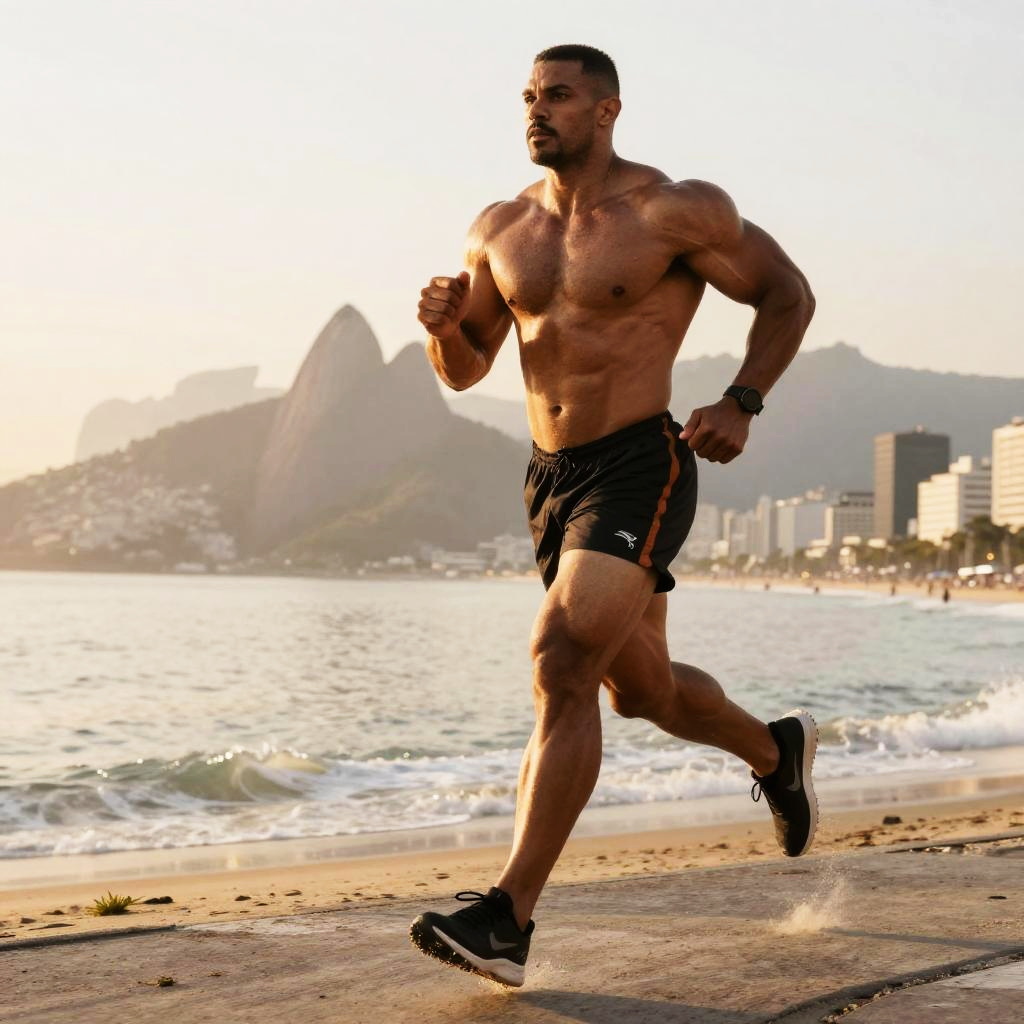 Strong male physique running along a beach during golden hour, sun highlighting chiseled muscles, wind tousled hair, realistic ocean waves, energetic mood, photorealistic style