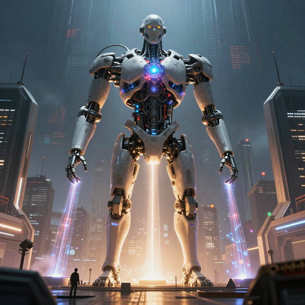 Human generator depicted as a colossal biomechanical structure towering over a futuristic cityscape, emitting streams of light as it assembles humans from energy, digital effects blending with organic elements, atmospheric depth, sci-fi epic scene.