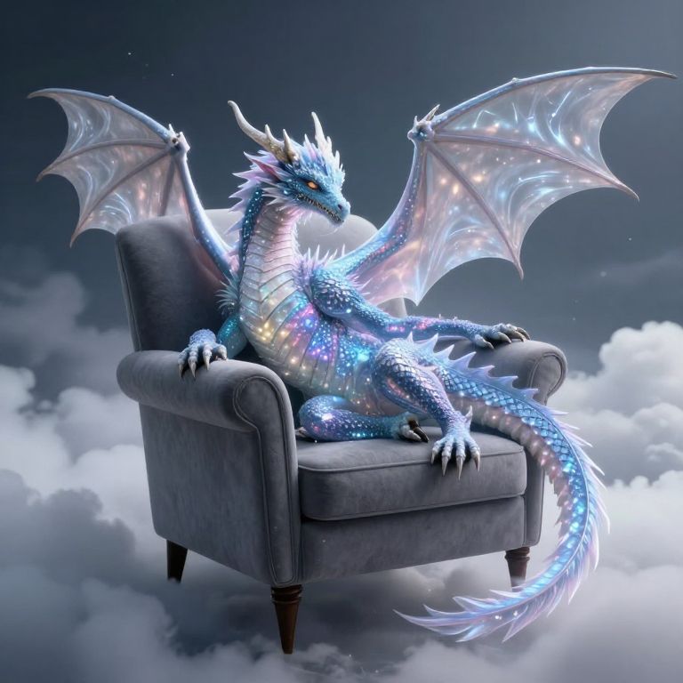 Digital artwork of a luminescent blue dragon with iridescent scales and crystalline wings reclining on a plush, gray armchair. The dragon's wings are spread wide, displaying a mesmerizing pattern of glowing blue and white lights. The dragon's body is muscular, with sharp claws and a long, glittering tail. The armchair is elevated above a backdrop of fluffy white clouds, creating a surreal, ethereal atmosphere. The dragon's eyes are sharp and focused, adding a sense of regality and power to the scene. The overall image has a magical and fantasy-like quality.