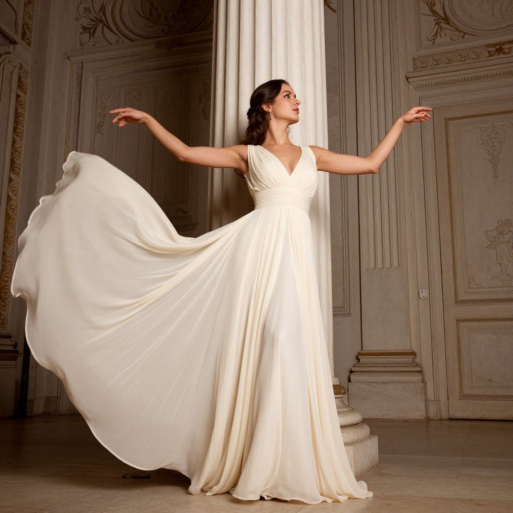 Gracefully poised against a classical column, a woman in an elegant cream gown extends her arms, her flowing skirt cascading around her as she stands in a grand, ornately decorated interior.