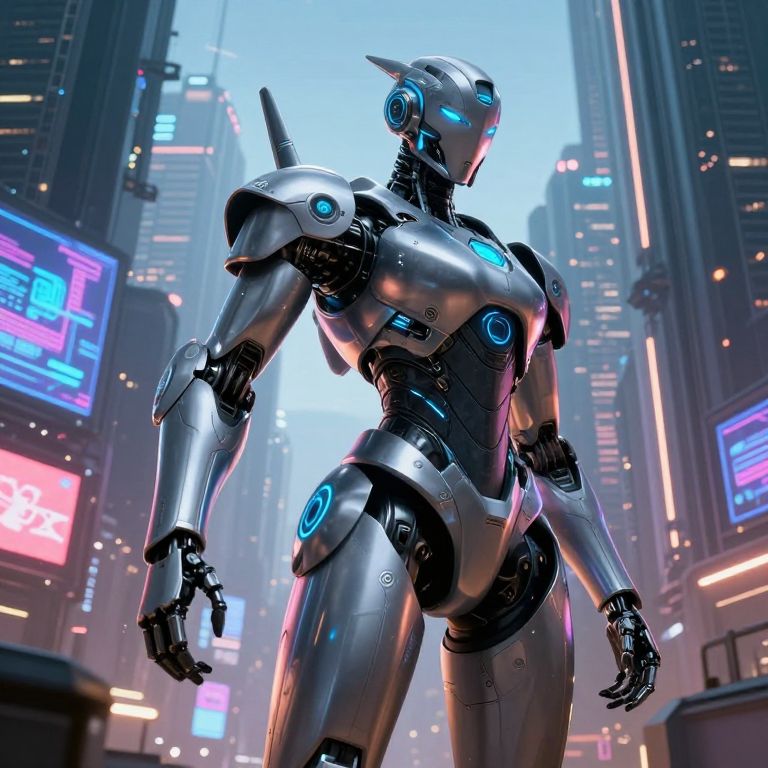 A highly detailed CGI image of a futuristic female android standing in a bustling, neon-lit cityscape. The android has a sleek, metallic silver body with blue glowing accents on her joints and chest. She has a humanoid form with a curvy yet mechanical build, featuring a rounded chest and defined muscles. Her head is adorned with a helmet-like design with blue lights and a small antenna. The background is filled with towering skyscrapers, vibrant neon signs, and holographic advertisements, creating a cyberpunk atmosphere. The android's pose is confident and statuesque, with her arms slightly bent and her gaze forward.