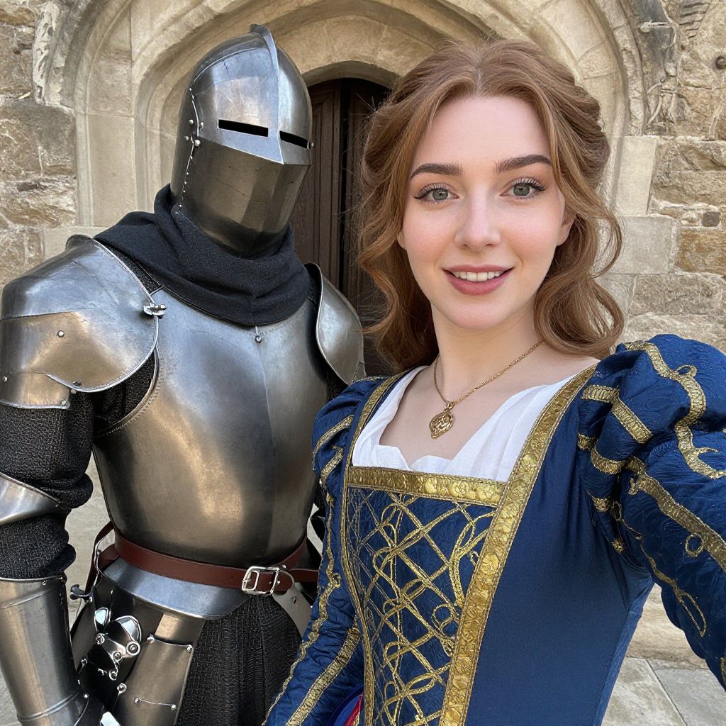 A medieval noblewoman in a blue and gold dress poses for a selfie with a knight in armor.
