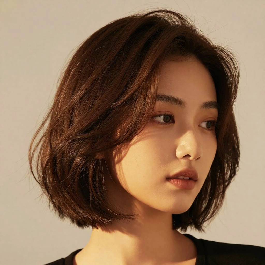 Close-up portrait of an Asian woman with a contour bob haircut featuring soft waves. The subject has natural makeup and warm golden hour lighting that highlights the hair texture. The photo is taken in a studio setting, emphasizing an elegant and trendy look.