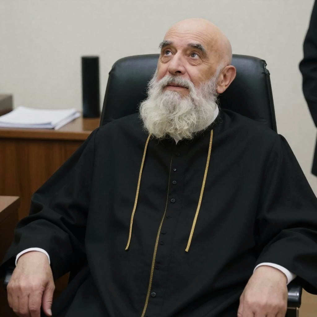 Photograph of an older man with a gray cap, gold-framed glasses, and long white beard, focusing intently on a small, shiny, round object in his hand. He wears a black coat with a fur collar. Background is blurry with metallic and red elements. His expression is concentrated.