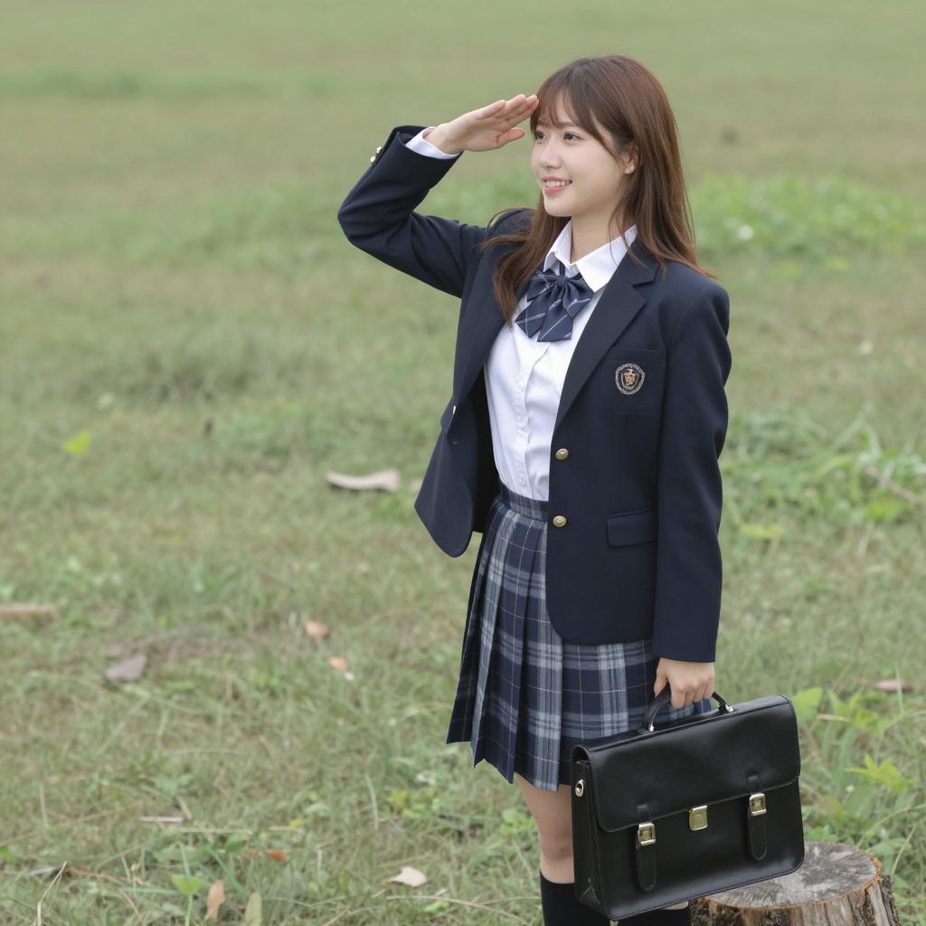 Portrait of a young Asian woman with long brown hair standing and waving with her right hand. She is wearing a black blazer with gold buttons, a white scarf, a black and white plaid skirt, and black knee-high socks. The background features a black wire fence and green grass, suggesting an outdoor setting, possibly a school field.