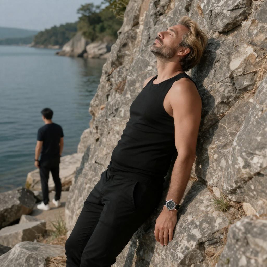 Photograph of a middle-aged man with blond hair and a beard, wearing a black sleeveless top and black pants, leaning against a rocky cliff. He has a watch on his left wrist. Background: a serene lake, rocky shore, and another man in dark clothing standing near the water's edge. Man's head tilted back, eyes closed, expression calm. Sunlight illuminates the scene.