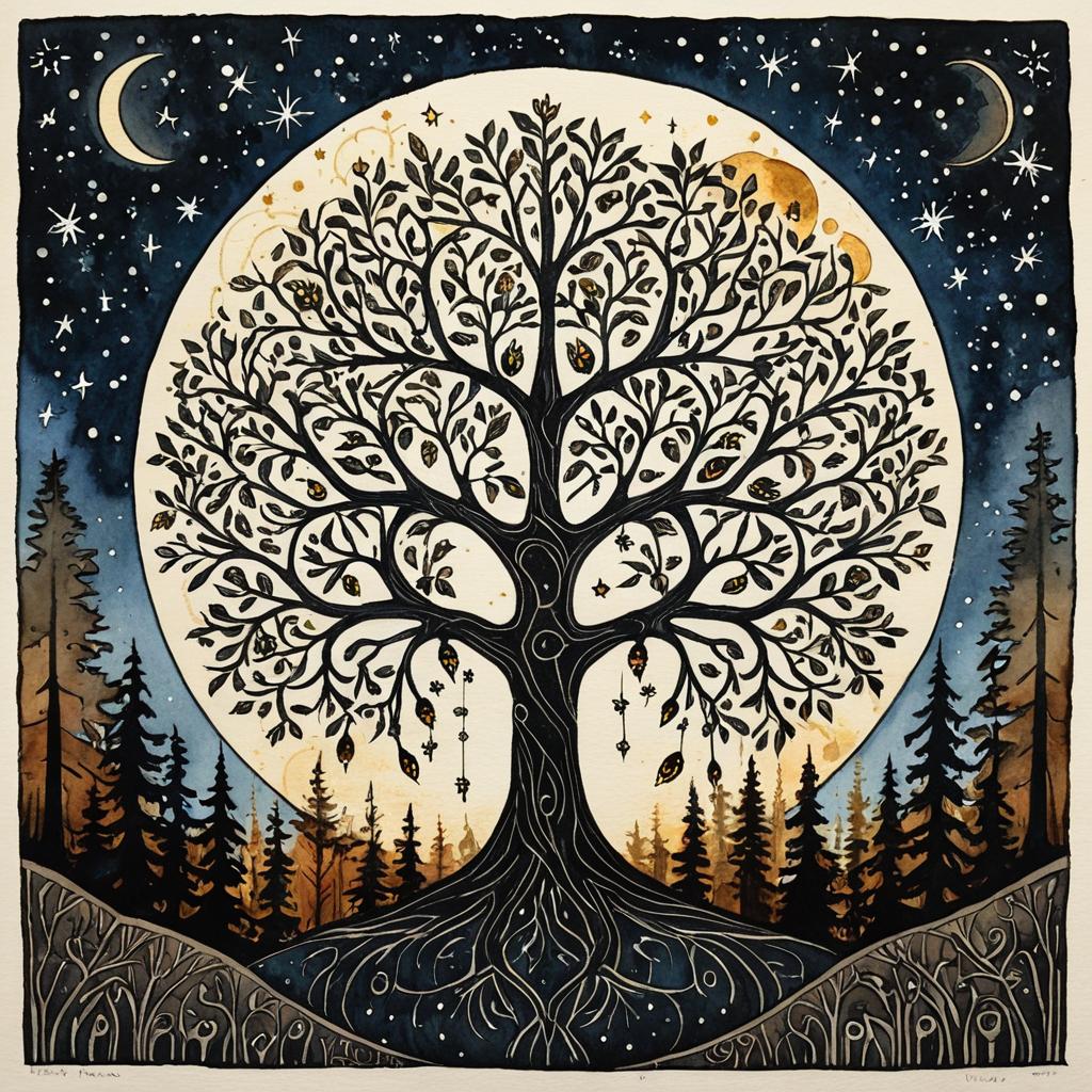 Artistic representation of a stylized Tree of Life with intertwined roots and branches adorned with golden feathers. The tree is set against a night sky featuring a crescent moon, a full moon, and a meteor shower above a desert landscape surrounded by rocky mountains. The artwork uses earth tones in watercolor and ink wash style, creating a mystical and symbolic atmosphere.