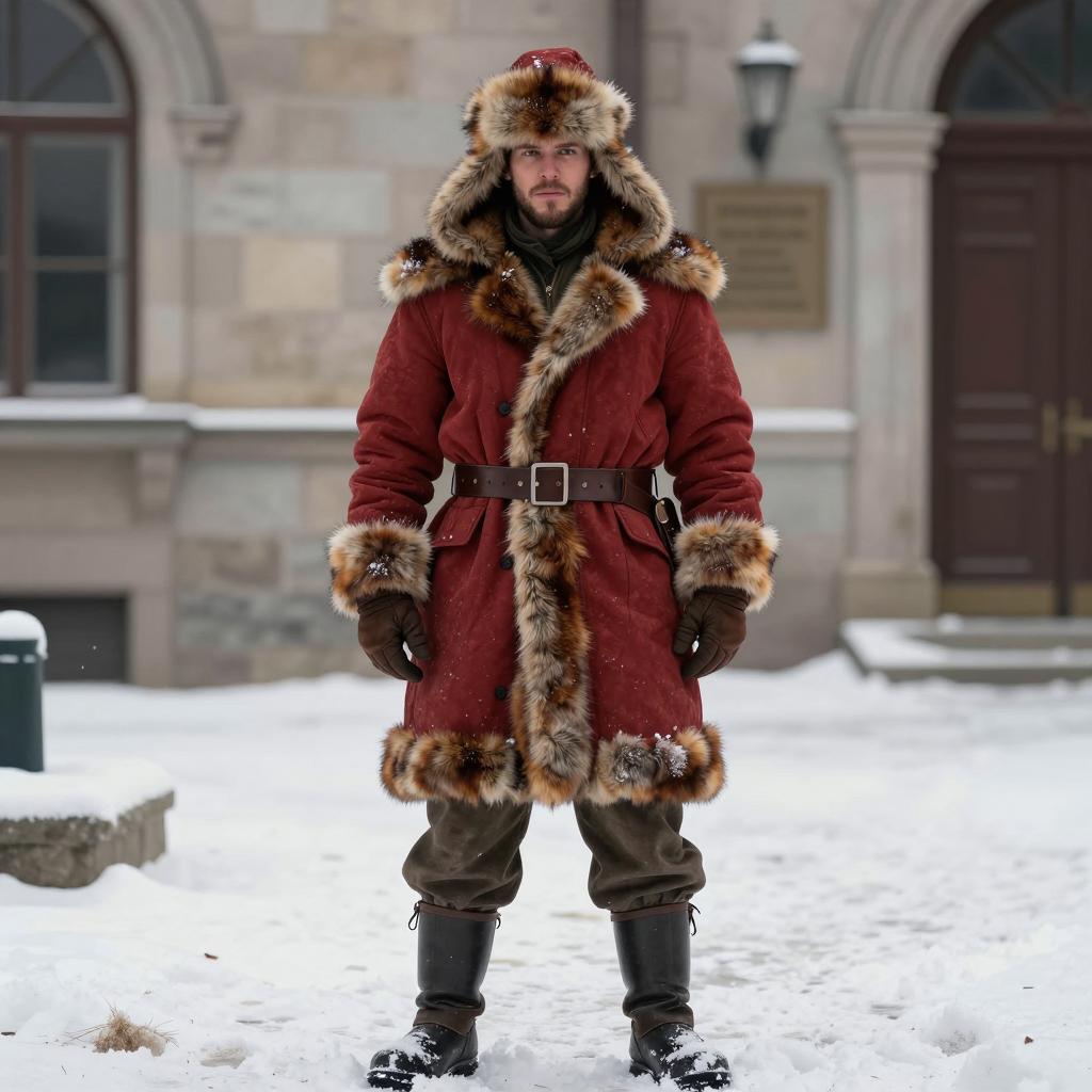 Winter soldier adult costume, photorealistic, full body shot, male character, winter attire, red fur-trimmed coat, hood with fur lining, brown leather belt with fur accents, brown gloves, dark pants, snow-covered ground, urban background, stone building with arches, sign in background, serious expression, bearded, medium build, white male, daytime, outdoor, snowy scene, realistic ures, detailed fur and fabric, cinematic style