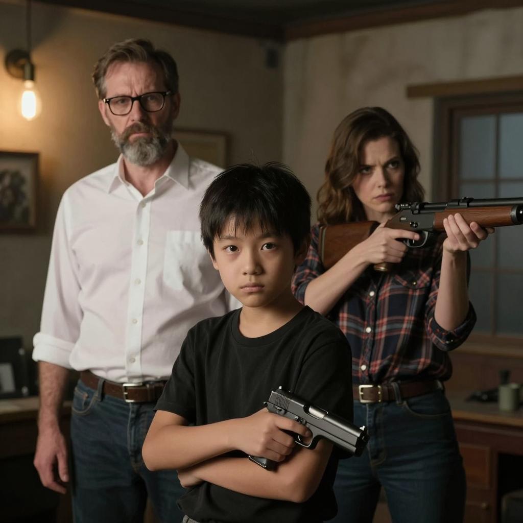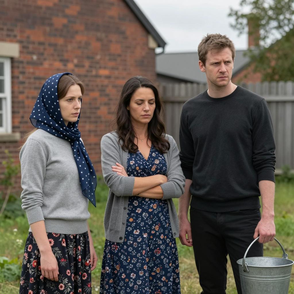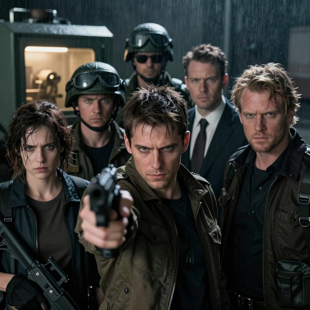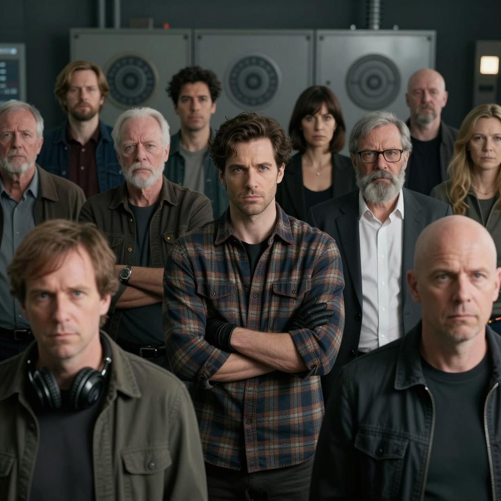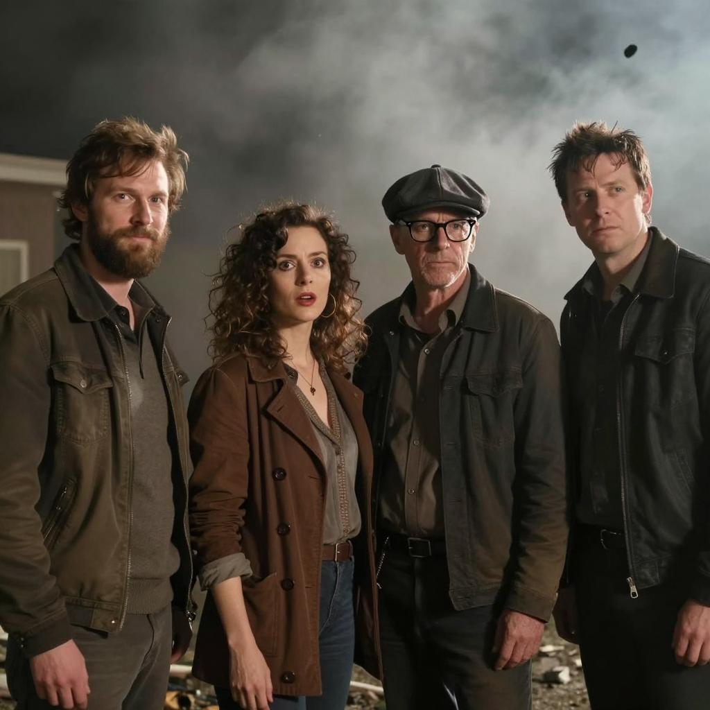 Group of five people in a dimly lit outdoor setting with smoke and falling debris. Man with brown hair and beard on left, woman with curly brown hair in center, man in flat cap and glasses in middle, man in dark jacket on right. Man on left has a slight smile, woman looks surprised. Smoky background.