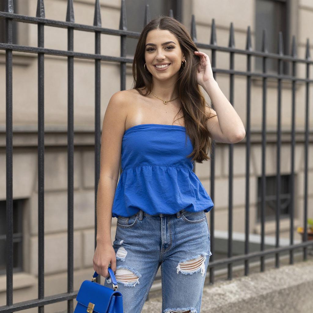 Photograph of a smiling young woman with long brown hair, wearing a bright blue strapless top and ripped blue jeans, standing against a black iron fence in front of a stone building. She holds a blue purse in her right hand and touches her hair with her left hand.