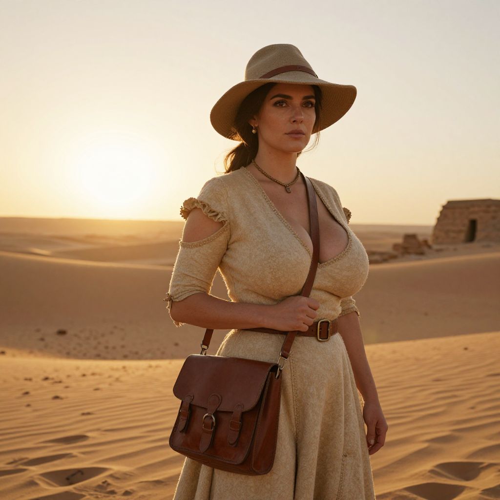 A realistic photograph of a 1930s-style archaeologist woman in a woman costume, wearing a wide-brimmed sun hat, a long woolen dress with exposed sleeves, and a leather satchel, standing in a golden desert sunset with dunes in the background, her face has a determined expression with soft brown eyes and a strong, intelligent look, the setting is a remote desert archaeological dig in the Sahara, with ancient stone ruins partially visible in the distance. The woman has big tits and cute face
