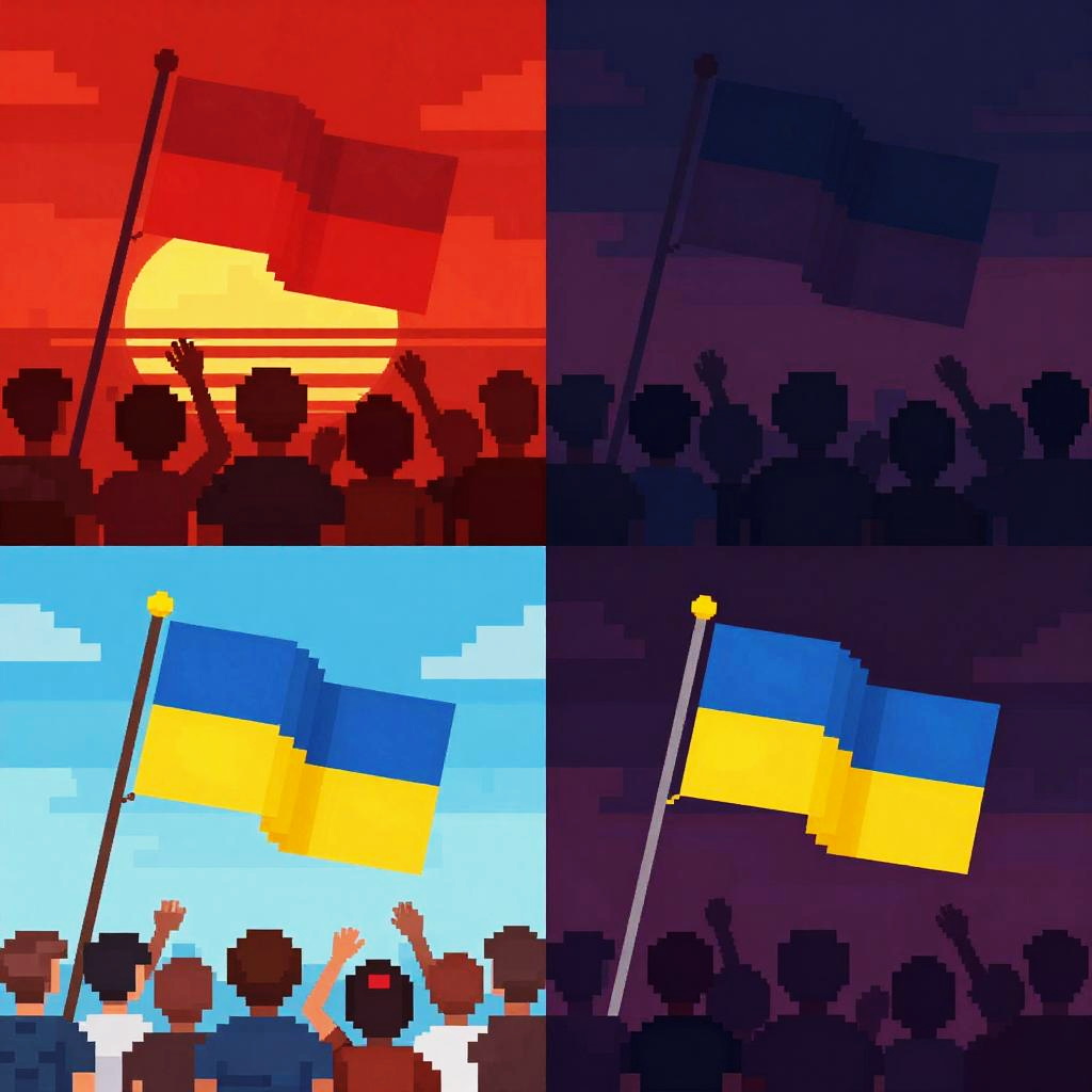This image is a pixel art collage with four quadrants, each depicting large crowds with flags and bright, colorful backgrounds. The top left shows a red sun with a silhouette of people and a flag. Top right features a dark sky with a silhouetted crowd and a flag. Bottom left displays a blue and yellow flag waving above a crowd. Bottom right has a dark background with a flag and dense crowd. The pixel art style adds a retro, digital feel.