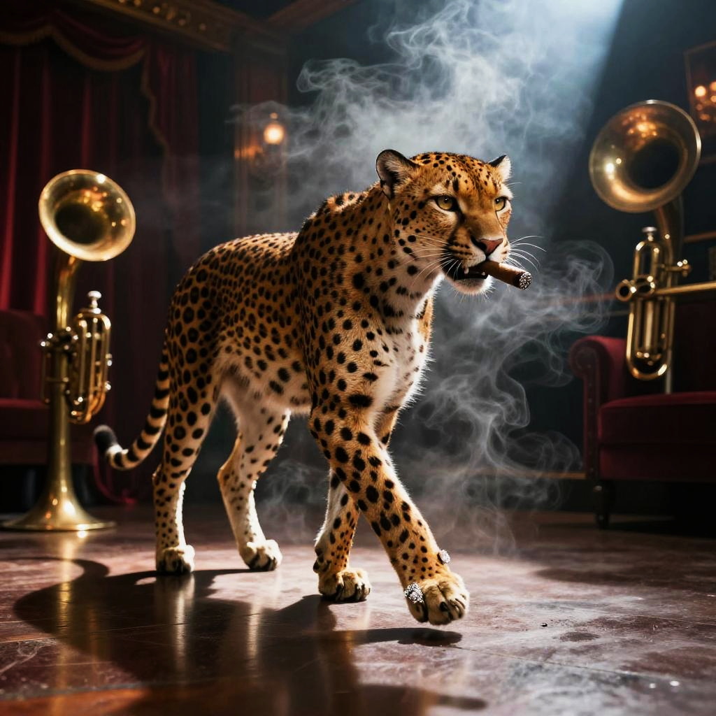 Gangster cheetah mob boss adorned with diamond rings and cigar moving with purpose, smoky 1920s jazz club with red velvet curtains and brass instruments, rendered in cinematic film noir. Thick smoke and deep shadows, rim-lit contours, volumetric beams through dust, reflective wood and brass, subtle grain, shallow depth, high contrast, atmospheric perspective, moody color grade, story-rich ambiance, SDXL, ultra-detailed