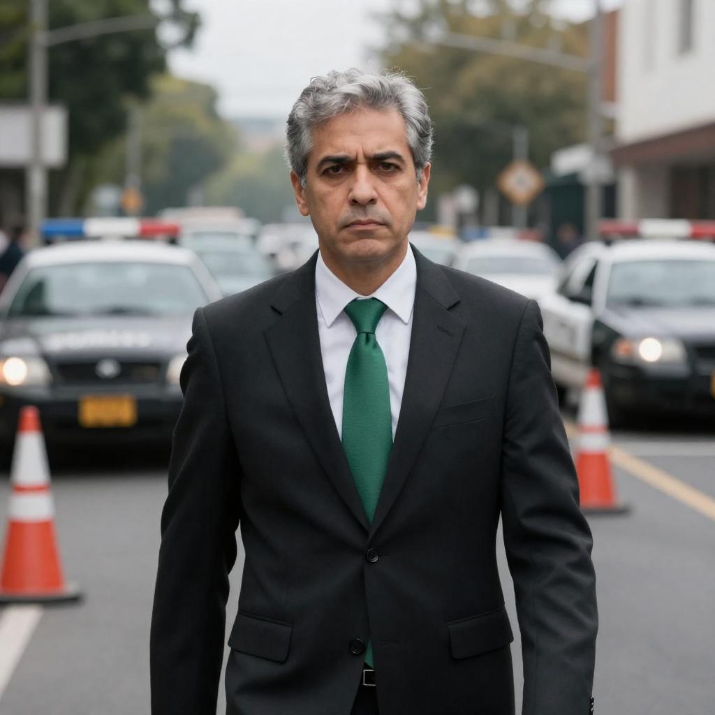 Photograph of a middle-aged man with short, slicked-back gray hair, wearing a dark blue suit, white shirt, and red tie, standing beside a shiny black car. He has a serious expression, with his right hand resting on the car's roof. The background is blurred with greenery and yellow accents.