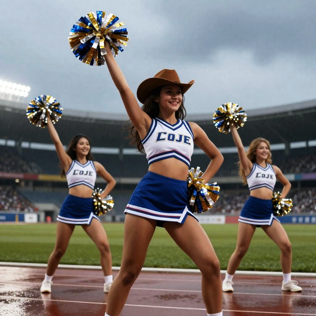 Twilight Cheerleaders Performing in Rainy Stadium