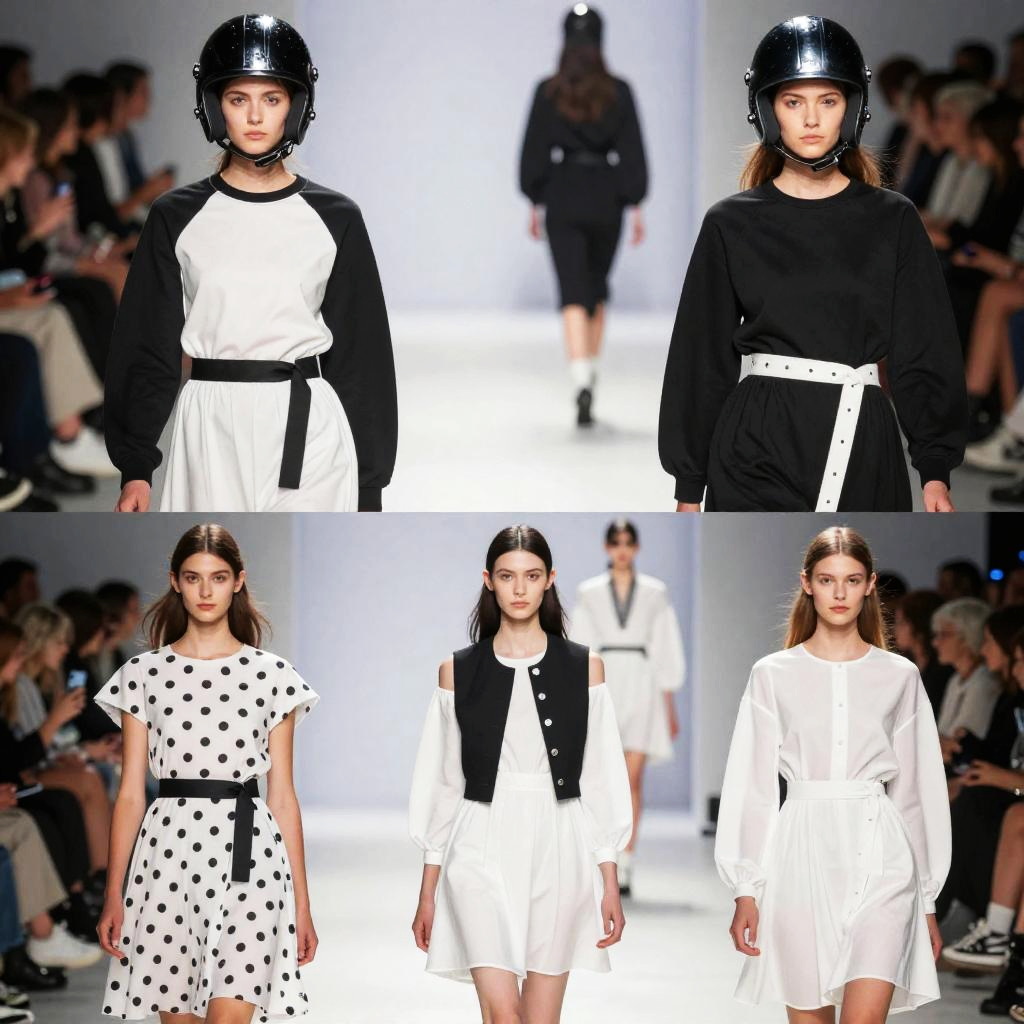 Photograph of a fashion runway show featuring four models in black and white outfits with helmets, polka dots, and belted dresses. Bright white background